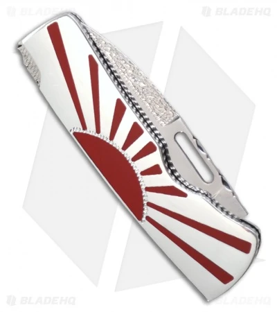 This Blackie Collins designed folding knife from Paragon has been customized by Michael Prater of Painted Pony design. The polished stainless steel blade from Seki-City Japan has been custom filed along the spine (see picture #3). The handles are beautifully crafted with the Rising Sun on both sides. This knife comes with a walnut display case and certificate of authenticity.
