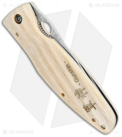 This Mcusta Gunshin knife has grooved white micarta scales over a liner lock frame. The blade is made from SPG2 steel. The pivot pin washer system makes the blade action silky smooth. Features ambidextrous thumb hole opener for one hand opening. Includes nylon sheath.