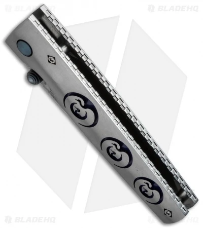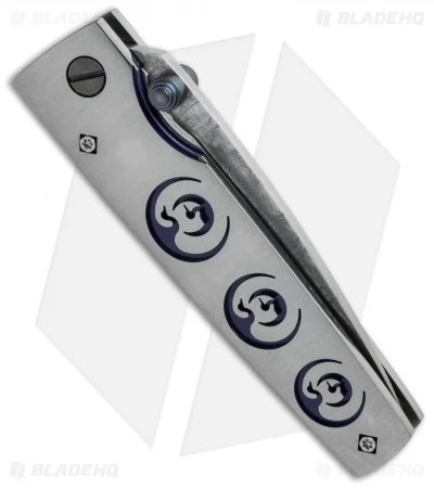 The Tsuru folder is part of the Kamon (Family Crest) series of knives from Mcusta. It features a stainless steel handle with decorative cutouts and a VG-10 core Damascus steel blade. It has a slim build and includes a pouch.