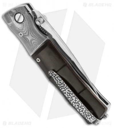 The MC-146 knife from Mcusta features a VG-10 stainless steel blade. The handles are made with bamboo scales over a steel frame and Damascus bolsters. Includes a carry sheath and a hammered finish reversible pocket clip (tip-down). The ambidextrous thumb stud allows for easy one hand opening with locking liner mechanism.