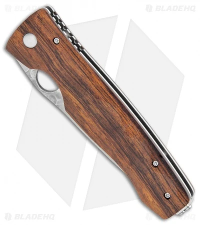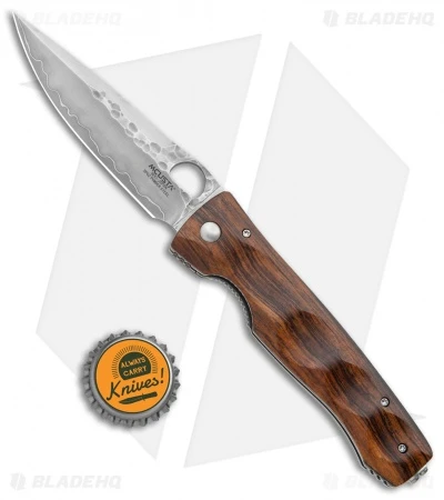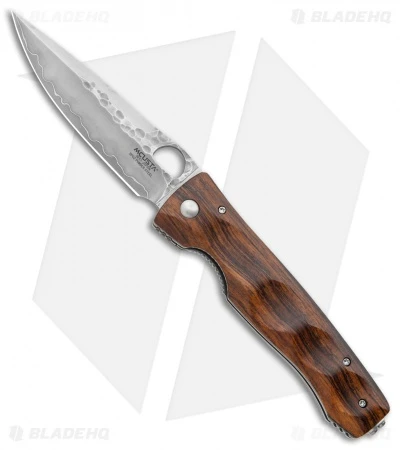 Beautiful knife from Mcusta Japan features a hammered embellished SPG2-powder steel blade. Includes ambidextrous thumb hole for one hand opening. The handle is contoured ironwood with stainless steel liner lock and a pocket clip that features a decorative script cutout.