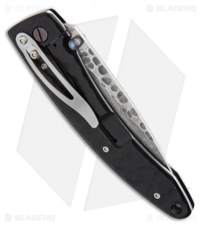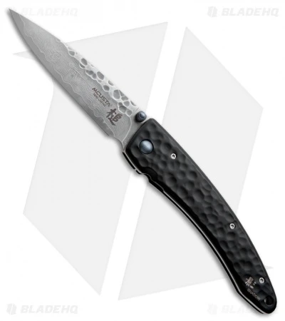 This Mcusta knife features a hammered pattern stainless steel handle and tip-down carry pocket clip. The blade is Damascus steel with a VG-10 core. The pivot pin washer system makes the blade action silky smooth. All these knives are hand finished, so the quality is of the highest caliber.