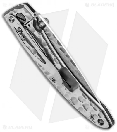 This Mcusta knife features a hammered pattern stainless steel handle and tip-down carry pocket clip. The blade is Damascus steel with a VG-10 core. The pivot pin washer system makes the blade action silky smooth. All these knives are hand finished, so the quality is of the highest caliber.