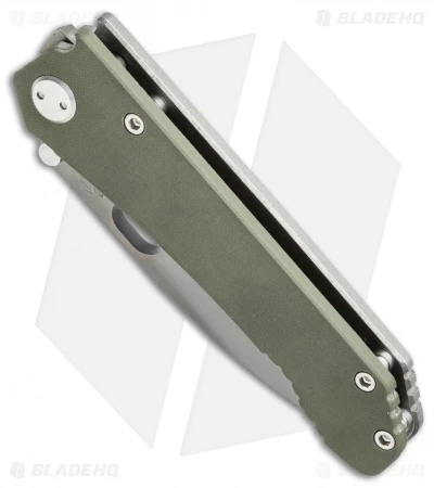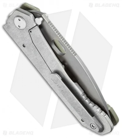 This knife features a OD green G-10 handle, tumbled titanium frame lock and a gray PVD coated D2 steel blade.