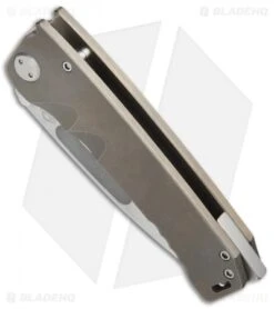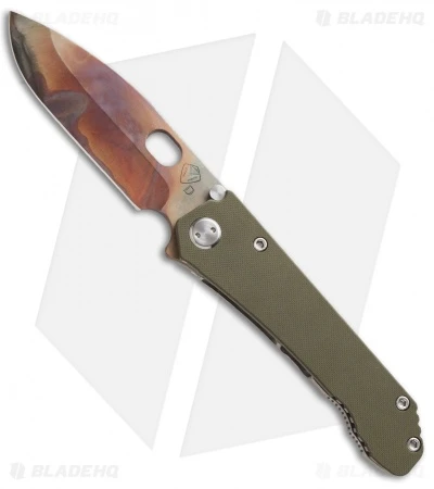 The knife features an OD green G-10 handle, tumbled titanium frame lock and a D2 steel blade with unique Vulcan finish. No two blade finishes will be the same and it will vary from the one pictured. Some are dark, some are light and some are multi-colored.