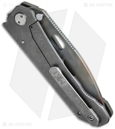 The knife features an OD green G-10 handle, tumbled titanium frame lock and a D2 steel blade with unique Vulcan finish. No two blade finishes will be the same and it will vary from the one pictured. Some are dark, some are light and some are multi-colored.