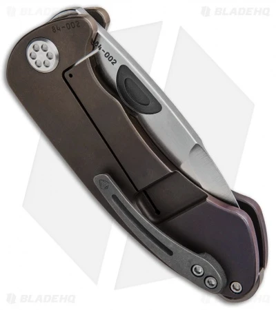 The Theseus, named after the hero who vanquished the Minotaur in ancient Greek mythology, is built in true Medford style. This custom model sports a satin finished D2 tool steel blade with a stepped thumb groove and extended tang to facilitate quick one-handed operation. Its titanium frame lock handle has a bronze fade anodized finish, custom sculpting, and a one-of-a-kind pocket clip.