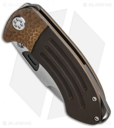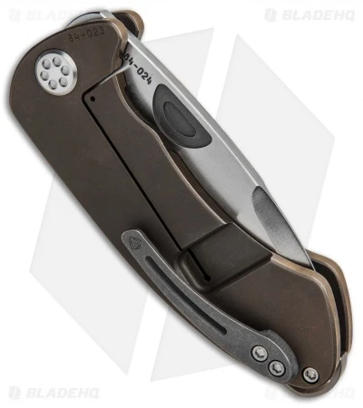 The Theseus, named after the hero who vanquished the Minotaur in ancient Greek mythology, is built in true Medford style. This custom model sports a satin finished D2 tool steel blade with a stepped thumb groove and extended tang to facilitate quick one-handed operation. Its titanium frame lock handle has a bronzed finish, custom sculpting, and a one-of-a-kind pocket clip.