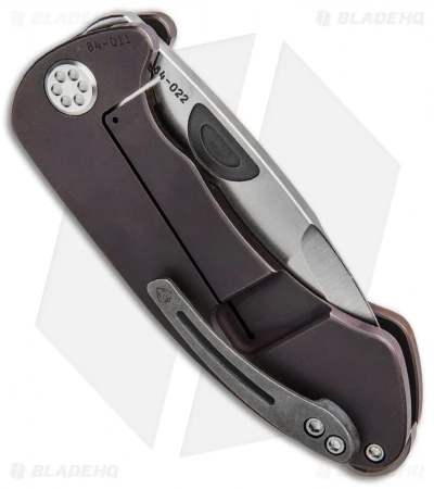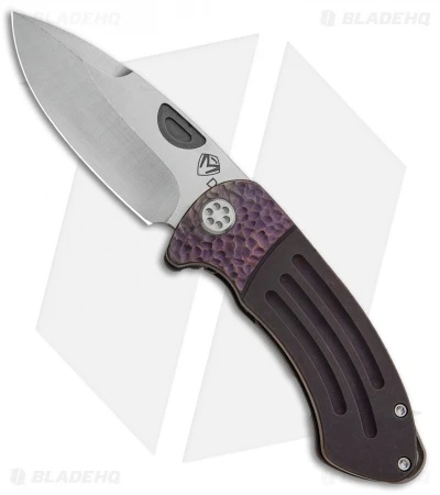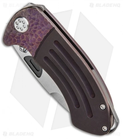 The Theseus, named after the hero who vanquished the Minotaur in ancient Greek mythology, is built in true Medford style. This custom model sports a satin finished D2 tool steel blade with a stepped thumb groove and extended tang to facilitate quick one-handed operation. Its titanium frame lock handle has a violet fade anodized finish, custom sculpting, and a one-of-a-kind pocket clip.