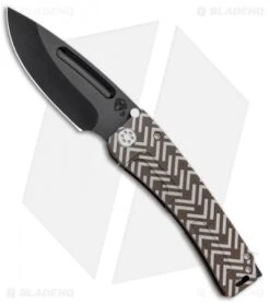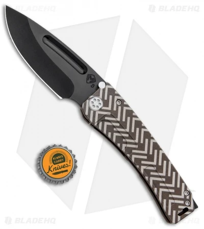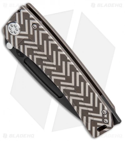 This custom Marauder-H features a bronze anodized “Chevron” patterned handle. Its drop point blade is made from 3V steel with a black PVD finish and a deep thumb groove opener. The Marauder-H comes fitted with a stainless steel backspacer with striking tip, lanyard hole, and a secure tip-up carry pocket clip.