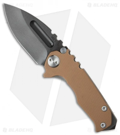 The Micro Praetorian G is a scaled down version of the regular Praetorian and a great size for those looking for a more discreet knife. The Micro has the same build, with a 1/8″ thick, stonewashed titanium frame lock and textured coyote G-10 scale. The Praetorian has a tip-up carry pocket clip and beefy glass breaker tip. This mighty knife has a black oxide coated D2 tool steel blade with no-bull spine texture and a wide thumb groove opener. Comes in a waterproof case.