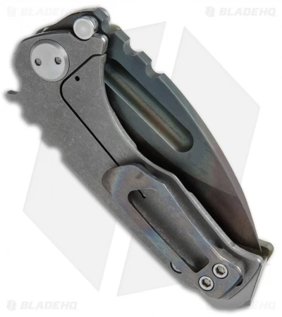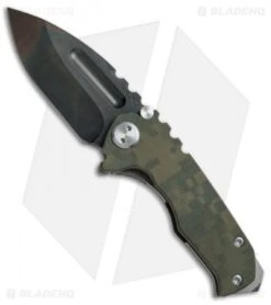 This Micro Praetorian model has a digi camo G-10 handle with a custom titanium pocket clip and a Vulcan finished blade. Each Vulcan finish is unique and will vary for every knife.