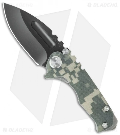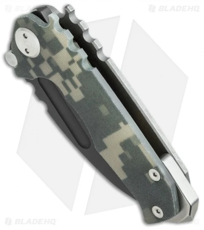 This model has a digi camo G-10 handle with a tumbled titanium frame and a black PVD finished blade.