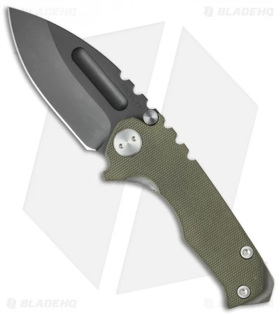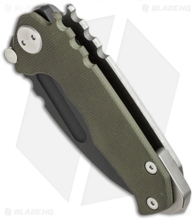The Micro Praetorian G is a scaled down version of the regular Praetorian and a great size for those looking for a more discreet knife. The Micro has the same build, with a 1/8″ thick, stonewashed titanium frame lock and a textured OD green G-10 scale. The Praetorian has a tip-up carry pocket clip and beefy glass breaker tip. This mighty knife has a black oxide coated D2 tool steel blade with no-bull spine texture and a wide thumb groove opener. Comes in a waterproof case.