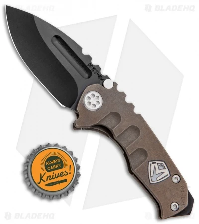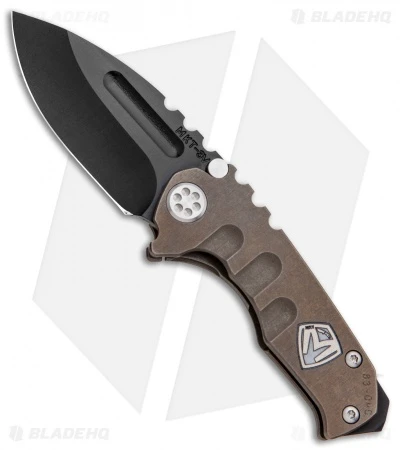 This custom Medford Micro Praetorian features a bronze anodized “M” logo engraved titanium handle with a blue anodized pocket clip. It sports a black PVD finished 3V steel blade.