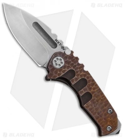 This custom Medford Micro Praetorian is an eye-catcher with its sculpted, bronze anodized full titanium handle. It sports a satin finished 3V steel blade.