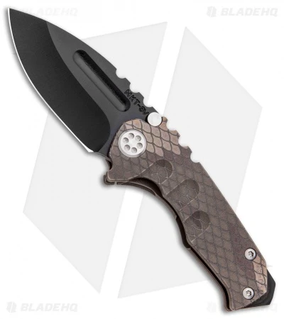 This custom Medford Micro Praetorian features a fish scale engraved, bronze anodized titanium handle with a flamed pocket clip. It sports a black PVD finished 3V steel blade.