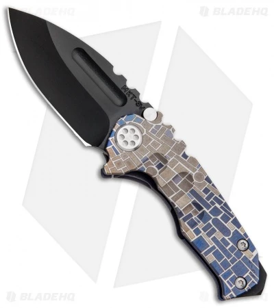 This custom Medford Micro Praetorian is an eye-catcher with its “Mosaic” engraved, blue anodized titanium handle. It sports a black PVD finished 3V steel blade.