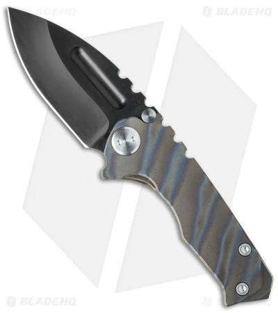 The Micro Praetorian is a scaled down version of the regular Praetorian and a great size for those looking for a more discreet knife. The Micro has the same build, with a 1/8″ thick titanium handle and frame lock. This model has a flame anodized handle and a black finished blade. The Micro Praetorian comes with a tip-up carry pocket clip and beefy glass breaker tip. This powerful knife has a D2 tool steel blade with no-bull spine texture and a wide thumb groove opener. Comes in a waterproof case.