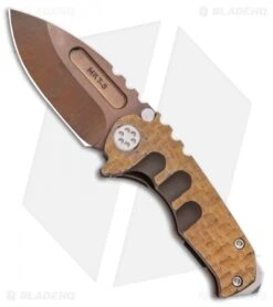 This custom Medford Micro Praetorian copper anodized titanium handle with a “Peaks and Valleys” texture. It sports a bronze finished 3V steel blade.