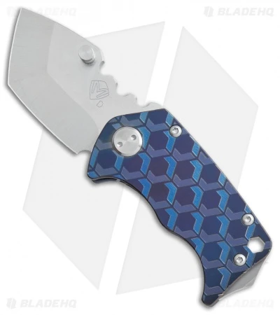 This Panzer model sports a titanium handle in a blue ano finish with a geometric pattern and a tumbled tanto blade.