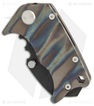 The MKT Panzer is simply compact & rugged. This small, but mighty tanto folder packs a lot of potential in its 3.5″ footprint. The D2 steel blade has a black finish with a thumb stud opener and dipped thumb rest. This version of the Panzer features a flamed titanium handle and frame. A steel glass breaker pommel spacer and a titanium pocket clip finish off the piece. The Panzer is a remarkably comfortable pocket knife. Comes with a waterproof case.