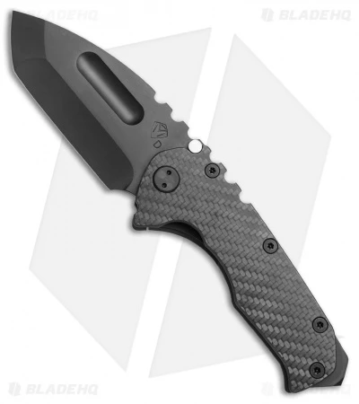The MKT Praetorian is a big folder in a relatively small package. This mighty knife has a black finished D2 tool steel tanto style blade with no-bull spine texture and a wide thumb groove opener. The frame is black titanium with a smooth carbon fiber scale up front. The Praetorian has a tip-up carry pocket clip and beefy glass breaker tip. Comes in a waterproof case.