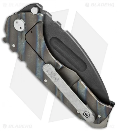 The MKT Praetorian is a big folder in a relatively small package. This mighty knife has a black oxide coated D2 tool steel tanto style blade with no-bull spine texture and a wide thumb groove opener. The handle is black G-10 with a flame colored titanium frame lock and pocket clip. The Praetorian comes in a waterproof case.