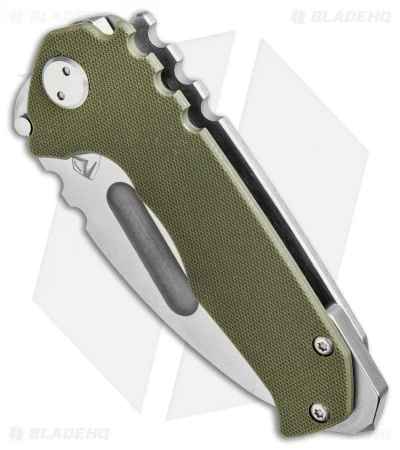 The Medford Praetorian Genesis is a more pocket friendly version of the full-size model, and was the original intended size for the Praetorian design. This knife has a tumbled D2 tool steel tanto style blade with no-bull spine texture and a wide thumb groove opener. The handle is made from OD Green G-10 with a tumbled titanium frame lock. The Praetorian Genesis has a tip-up carry pocket clip and beefy glass breaker tip. Comes in a waterproof case.