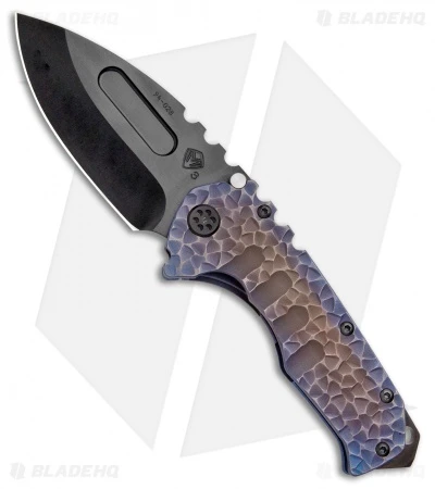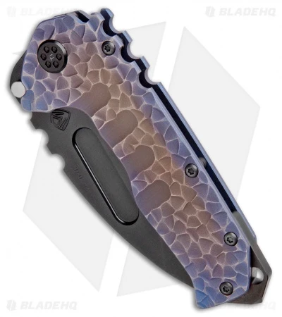 This Praetorian T model features a purple anodized titanium handle with a Peaks and Valleys texture and a black PVD coated CPM-3V steel blade. PVD coated hardware.