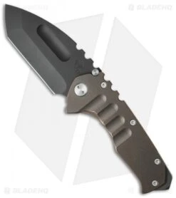 The MKT Praetorian T is a big folder in a relatively small package. This mighty knife has a black oxide coated D2 tool steel tanto style blade with no-bull spine texture and a wide thumb groove opener. The handle and frame are also tumbled titanium and bronze anodized; outfitted with a tip-up carry pocket clip and beefy stainless steel glass breaker tip. Comes in a waterproof case.