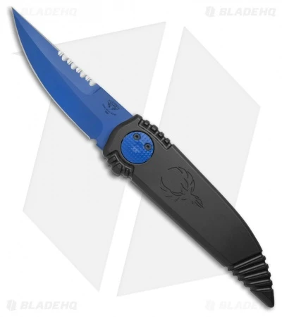 This Phoenix model sports a black handle with a phoenix laser etching and a CPM-S30V steel blade with a blue cerakote finish. The top edge of the knife has been sharpened with a partially serrated cutting edge.