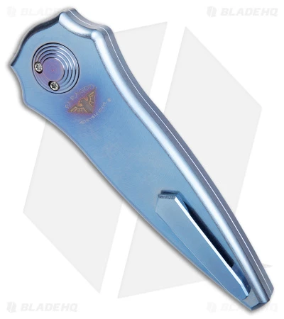 - Blue-anodized titanium handle with a smooth texture.