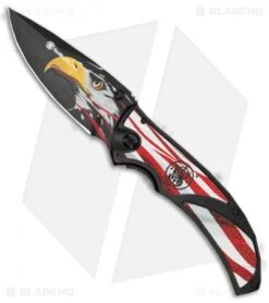 The Smith & Wesson America’s Heroes knife is the perfect blade to show off your patriotism. The bladed is a 3Cr13MoV steel with a graphic eagle’s head. The blade opens in a snap with the thumb stud. The handle is black anodized aluminum with an American flag print. This knife includes a gift tin.