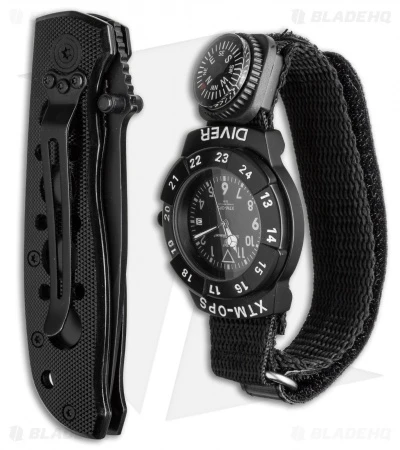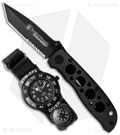 The Extreme Ops Combo Set from Smith & Wesson offers the Extreme Ops Folding Knife and the Extreme Ops Field Watch for one low affordable price. They come packaged together in a collectible tin gift box that is perfect for display or storage. The knife has a stainless steel blade and G-10 handle scales, and the field watch features quartz movement and an adjustable nylon band. This Extreme Ops Combo Set offers a great value on two Smith & Wesson tactical items.