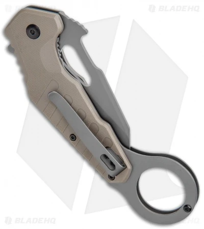 - FDE, tan G-10 handle with textured cutouts.